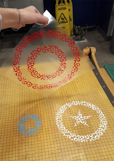 When using the vinyl machine I was rushed from another student. I wish I had made 3 separate files to cut out instead of cutting out 3 of the same pattern. This meant weeding out all of the little poptab holes on the colors I did not need.